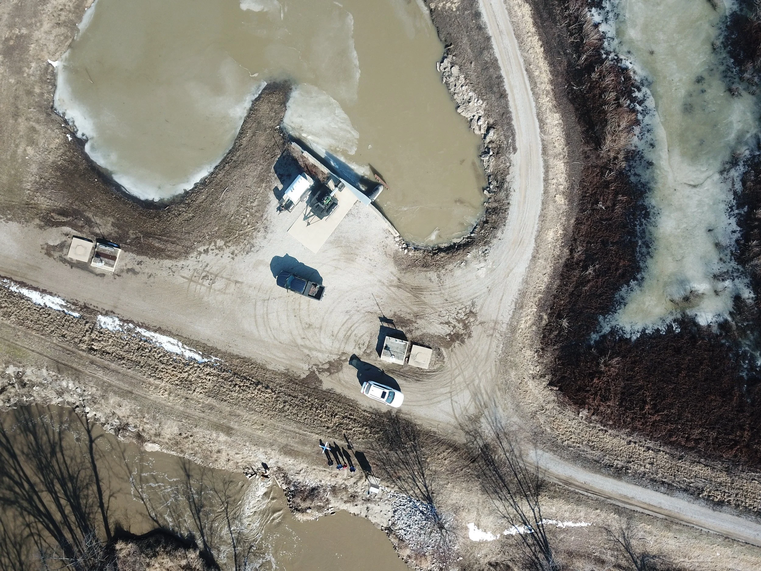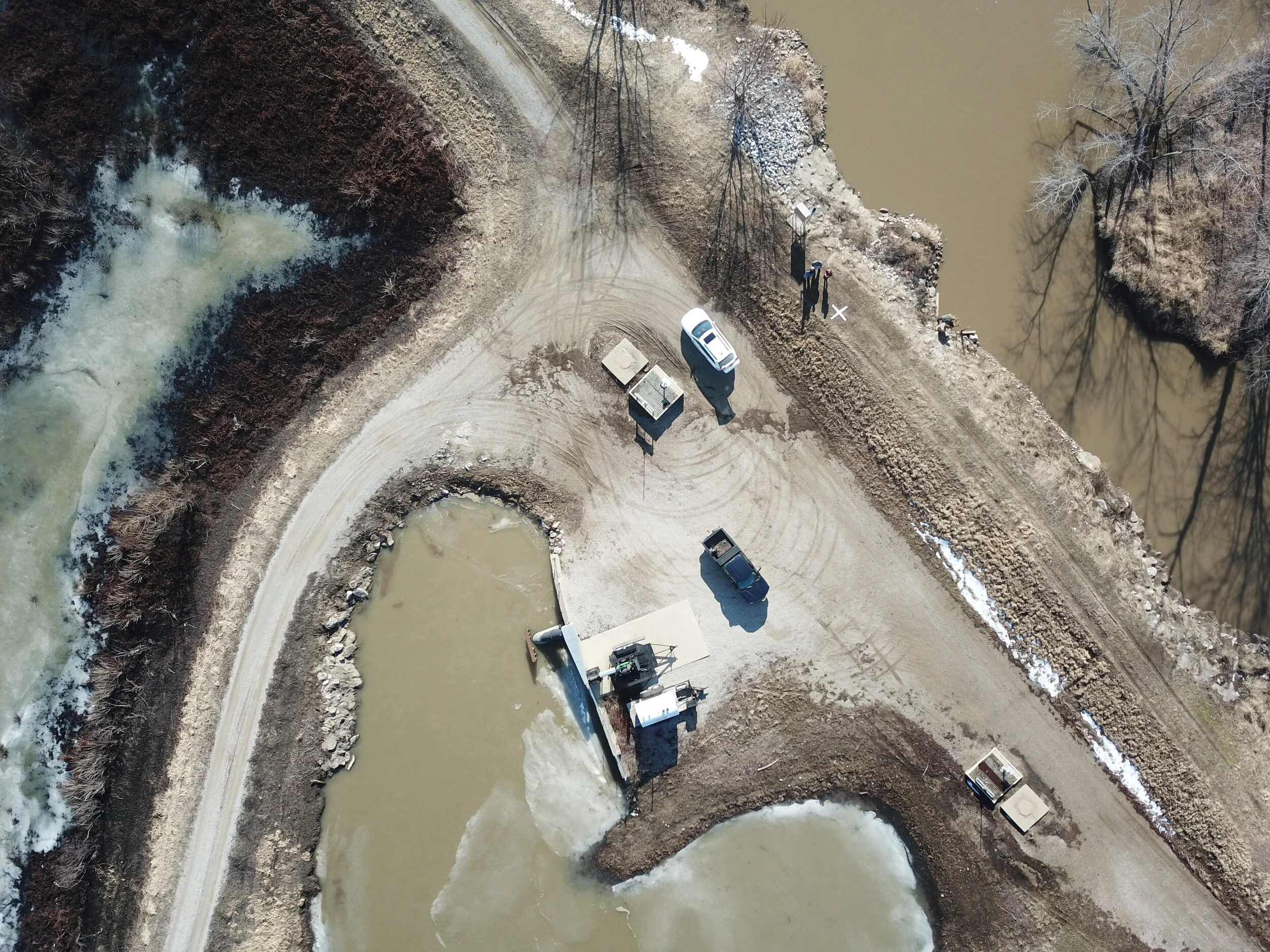This is another target we could drive to. It is near a pumping station at the center of our wetlands project. You can see the white target on top of the levee in the upper center area of the photo. These two photos showed us what the Mavic could do and that we could use it to capture photos of targets that were inaccessible due to mud and ice.